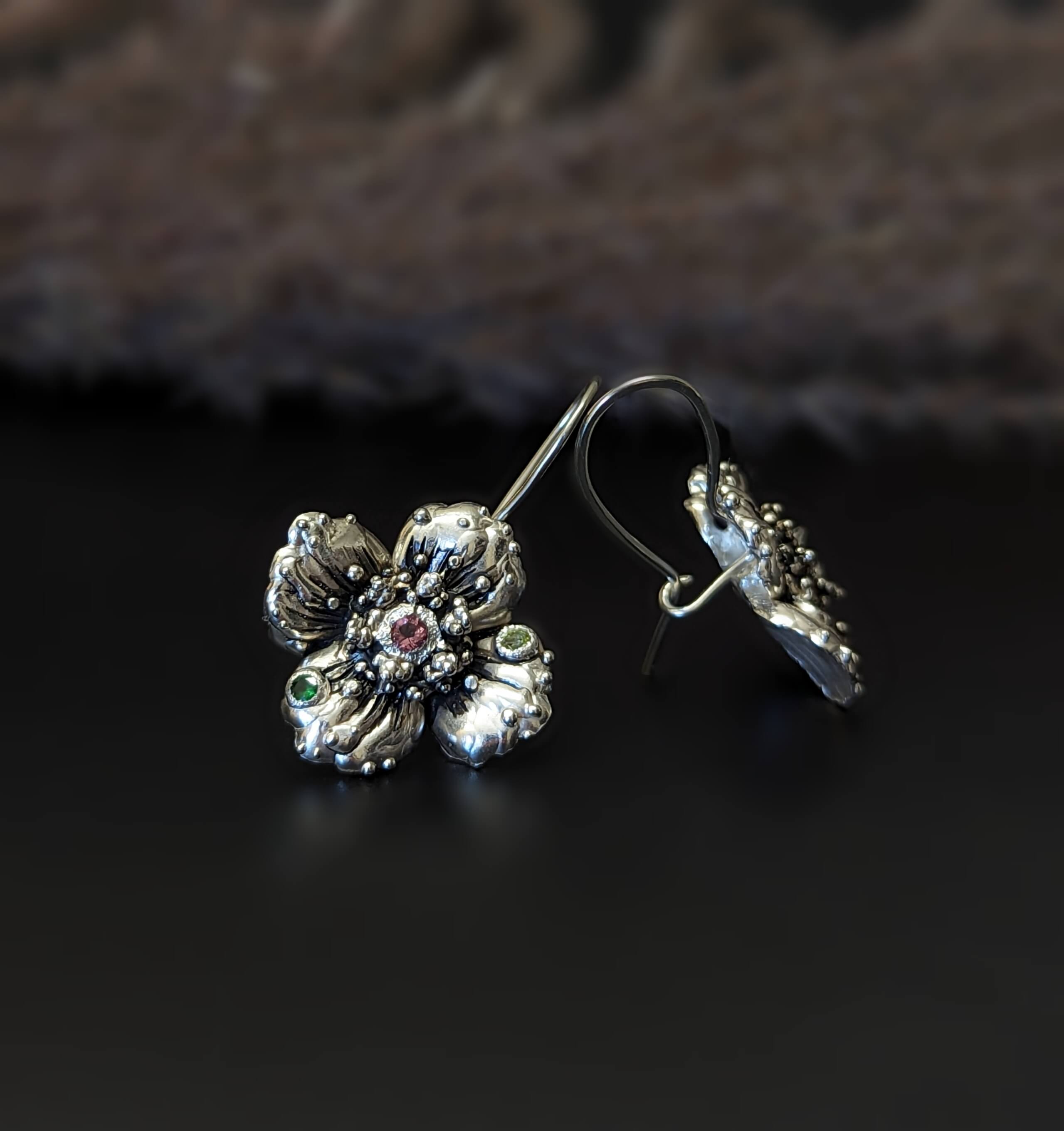 Žaismingi kabantys gėlės formos auskarai . Šie ryškūs vidutinio/didesnio dydžio auskarai puikiai pabrėš jūsų moteriškumą.
