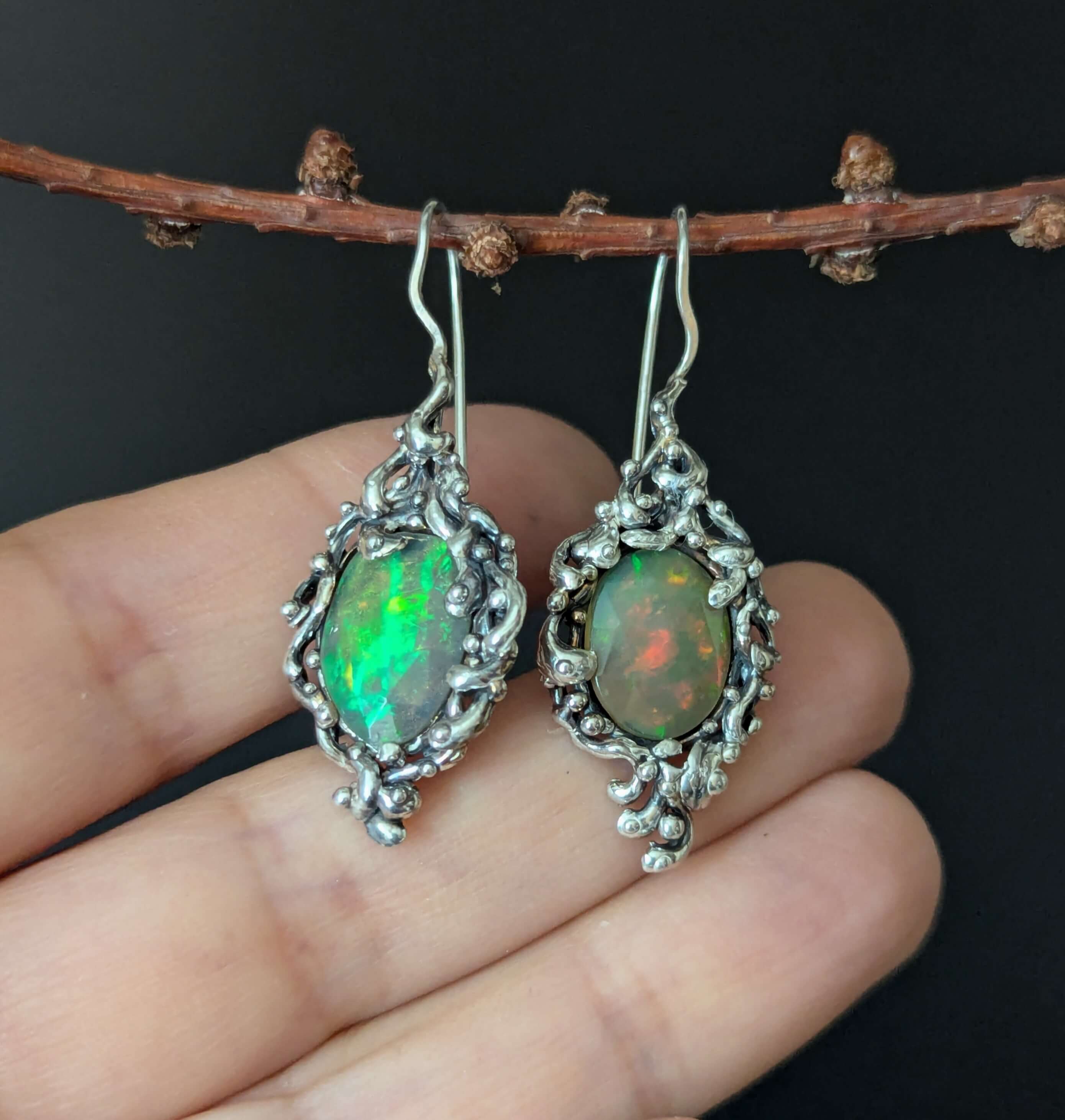 Rankų darbo sidabriniai auskarai „Liepsnojantis dangus“ su ryškiais Etiopijos opalais, įkomponuotais į subtilų raitytų ornamentų rėmą. Opalai tarsi spindintys dangaus liepsnos taškai, o detalus sidabro raštas suteikia auskarams elegancijos ir unikalumo.