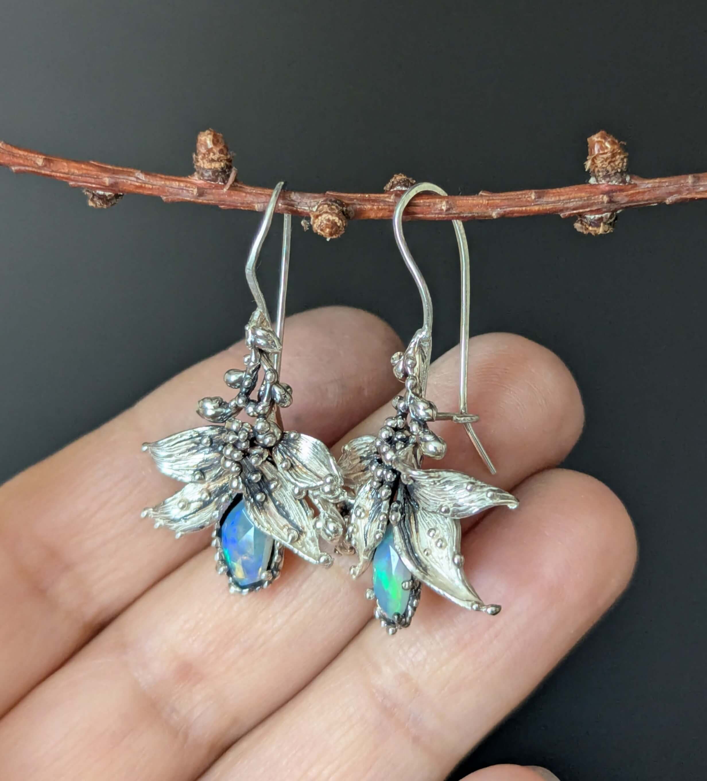 Elegantiški rankų darbo auskarai iš sidabro, dekoruoti augalų motyvais ir mažais burbuliukais. Šaltų atspalvių etiopijos opalai suteikia subtilų žaismą ir prabangos pojūtį. Kiekviena detalė kruopščiai sukurta rankomis, todėl auskarai unikalūs ir nepakeičiami.