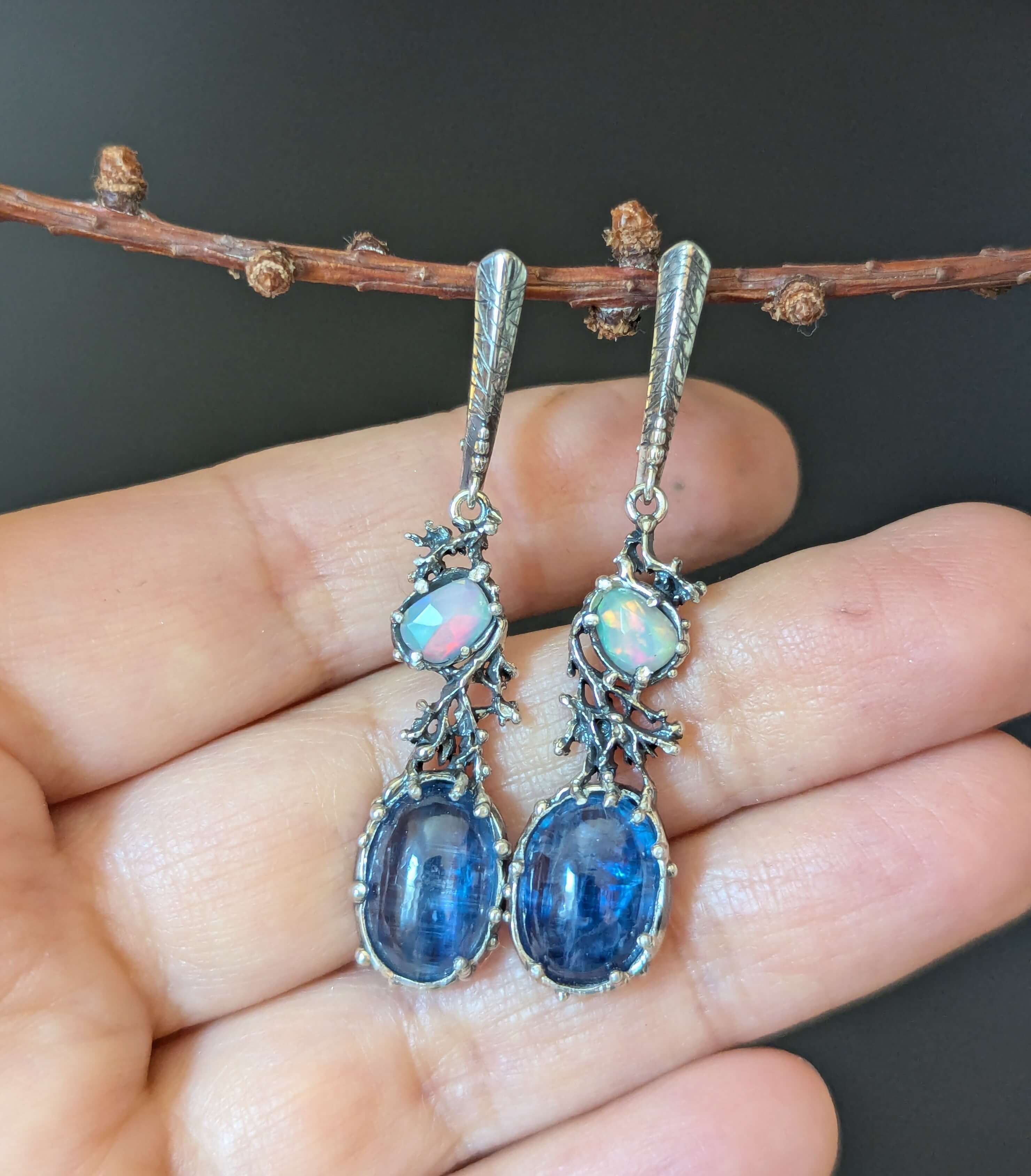 Vienetiniai rankų darbo sidabriniai auskarai su natūraliais mėlynais kianitais ir Etiopijos opalais. Gilios mėlynos spalvos kianitai primena pavasario dangų, o opalai atgyja šviesoje – jų viduje pasirodo švelnūs spalvų blyksniai, primenantys vaivorykštę po lietaus.