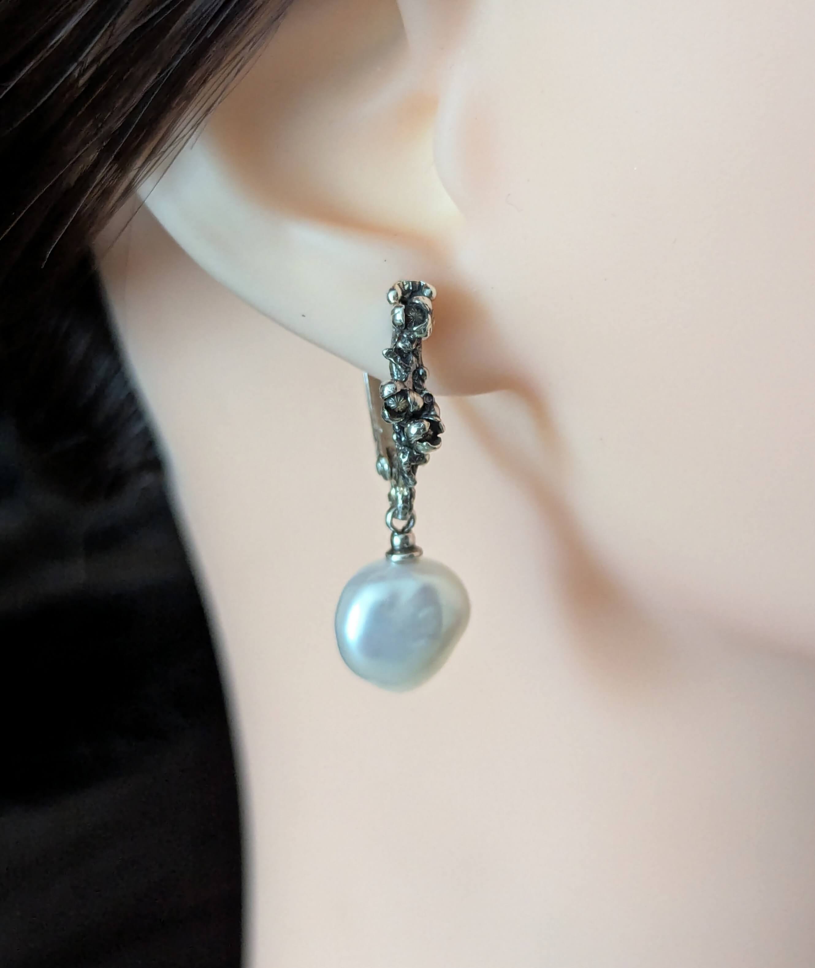 Rankų darbo kabantys neilgi auskarai „Gėlių širdys“ – žaismingas ir elegantiškas kūrinys, dekoruotas smulkiomis gėlytėmis ant rankų darbo angliškų užsegimų. Kabantys balti perlai lyg netaisyklingos širdelės suteikia auskarams subtilaus judesio ir natūralaus grožio.