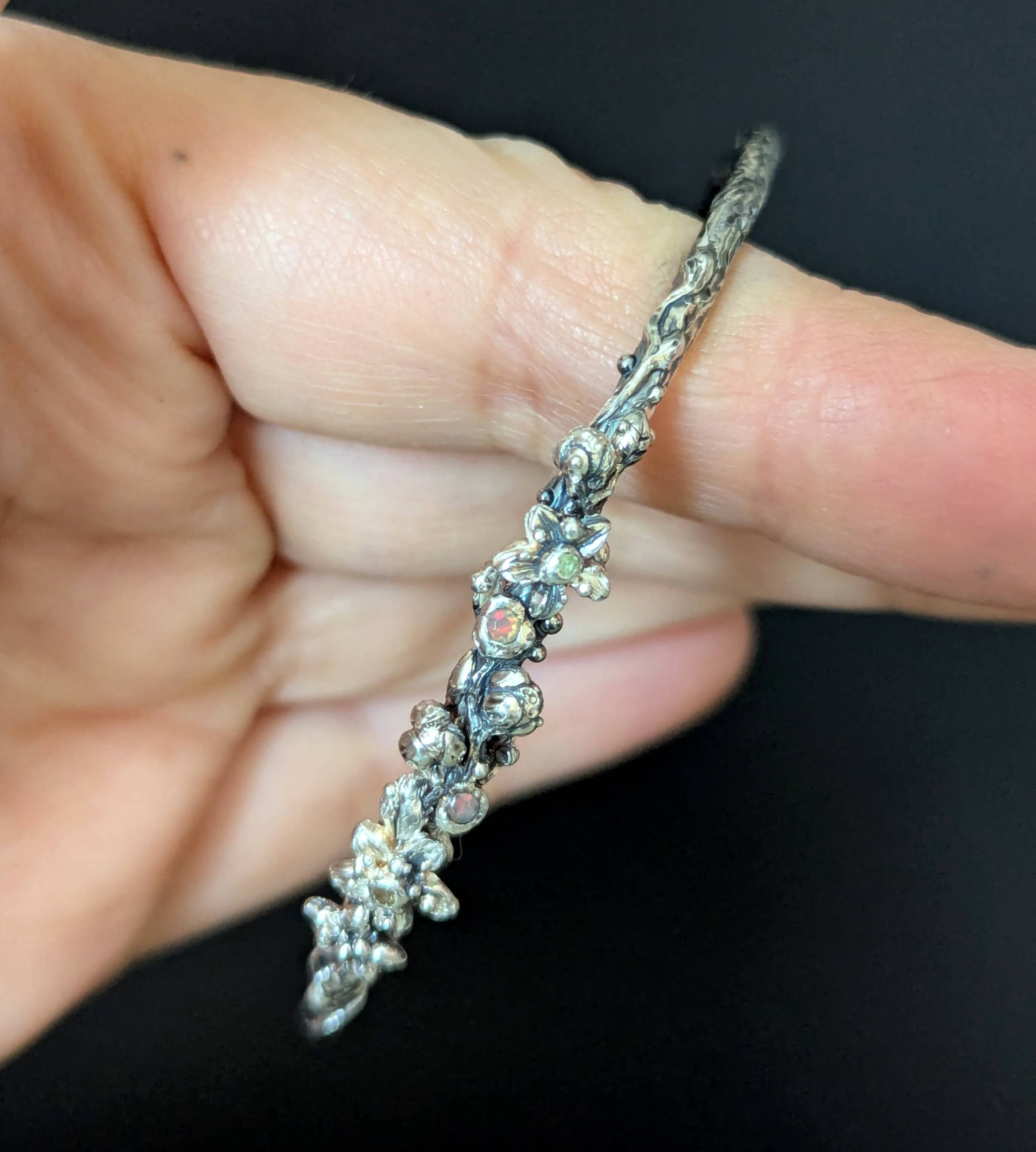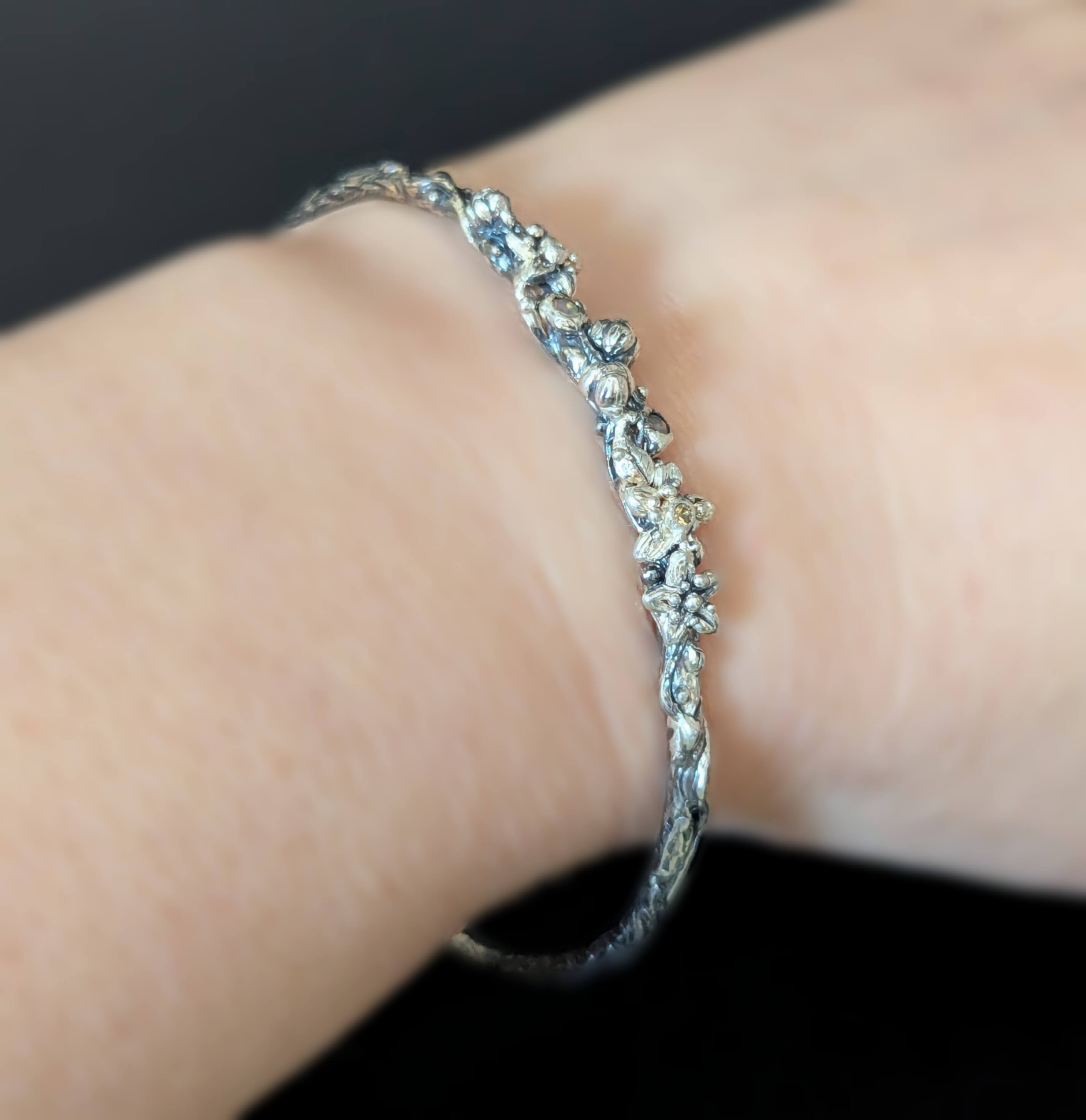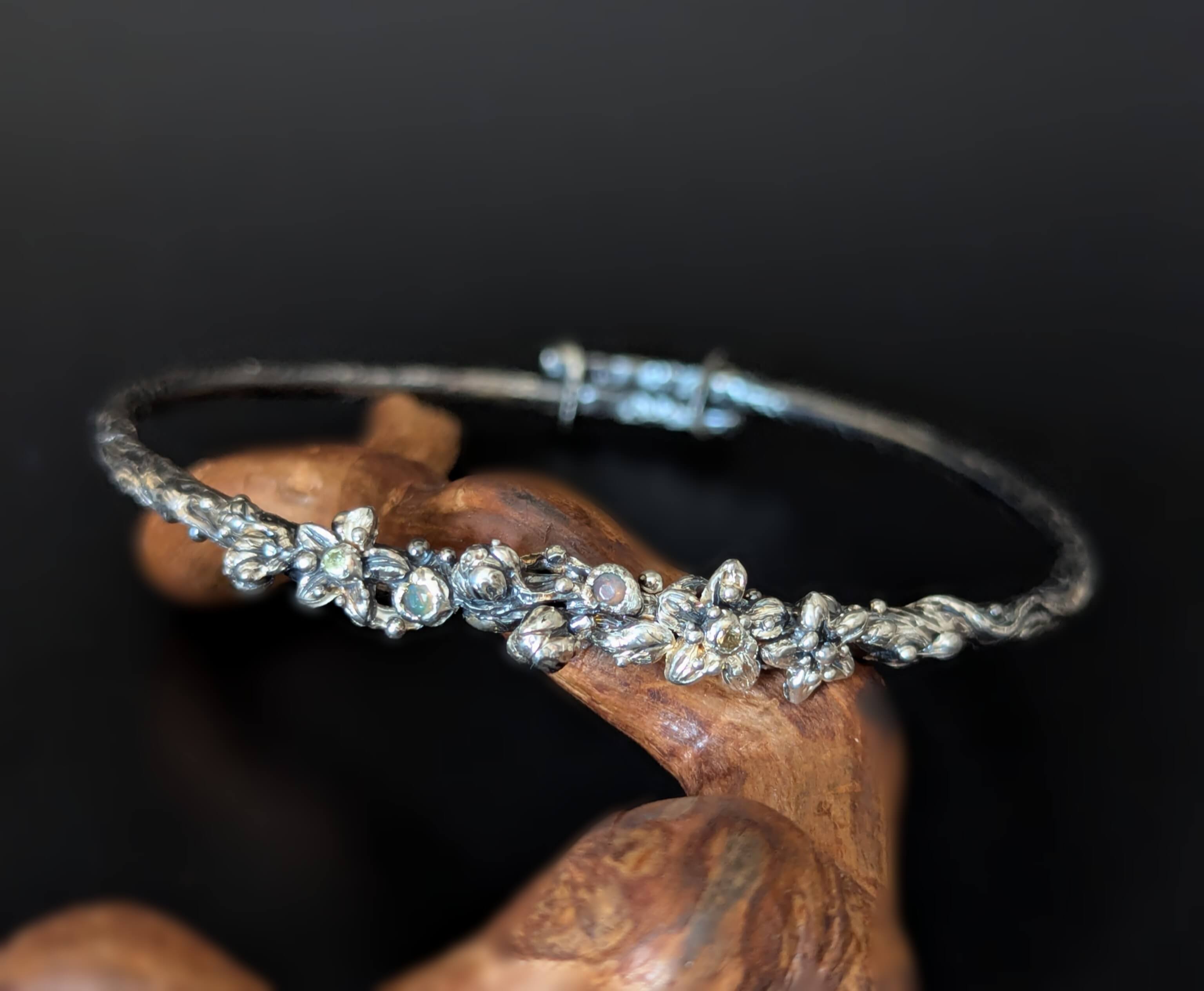 Priekinė apyrankės dalis dekoruota smulkiomis gėlytėmis ir mažais, derinimo nereikalaujančiais akmenėliais, subtiliai papildančiais bendrą formą.
