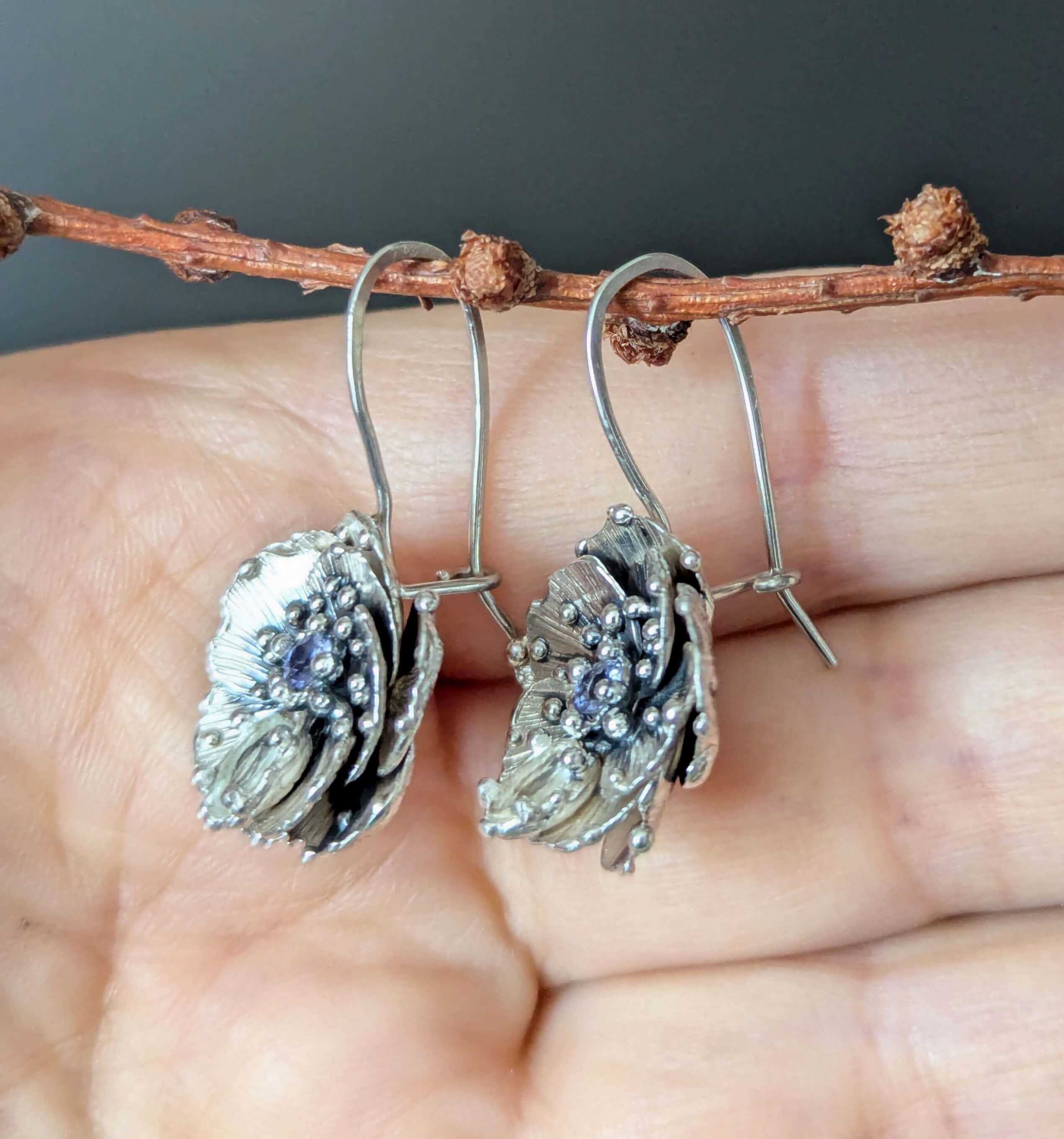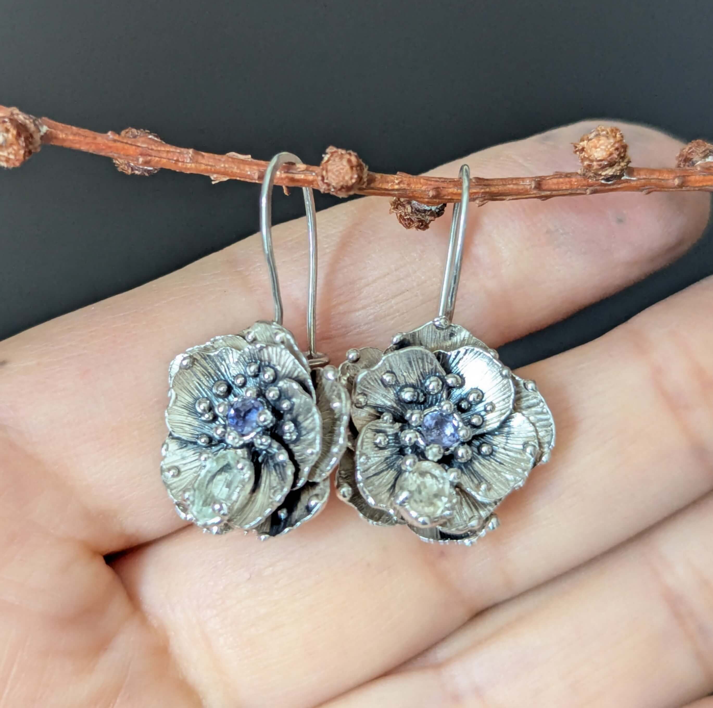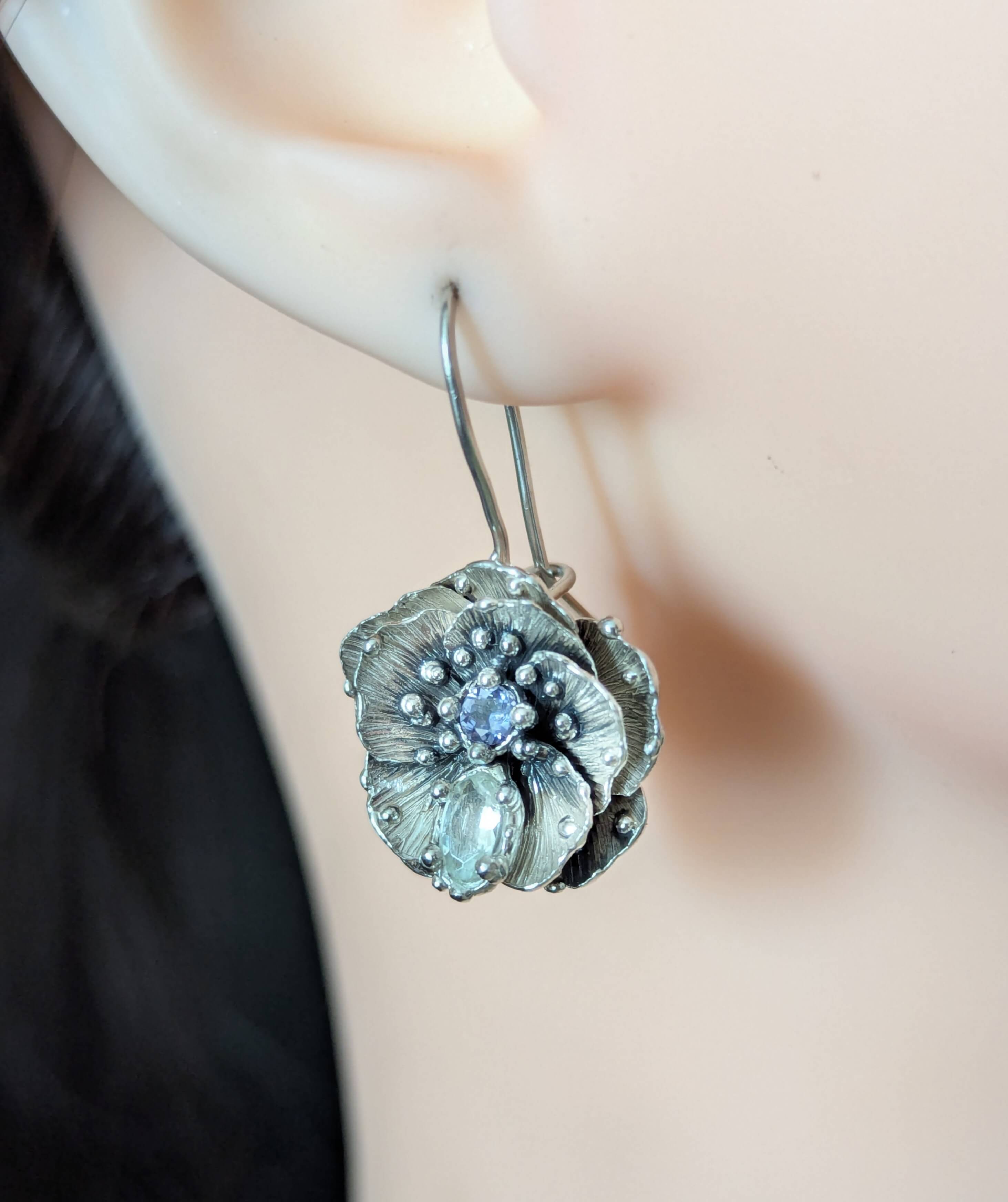 Sidabriniai auskarai, tipiškos prasiskleidusių gėlių formos. Puošti neryškiais jolitais ir subtiliais bespalviais turmalinais, kurie suteikia švelnaus spindesio. Idealūs kasdienai ir ypatingoms progoms, lengvai derinami prie kitų papuošalų.