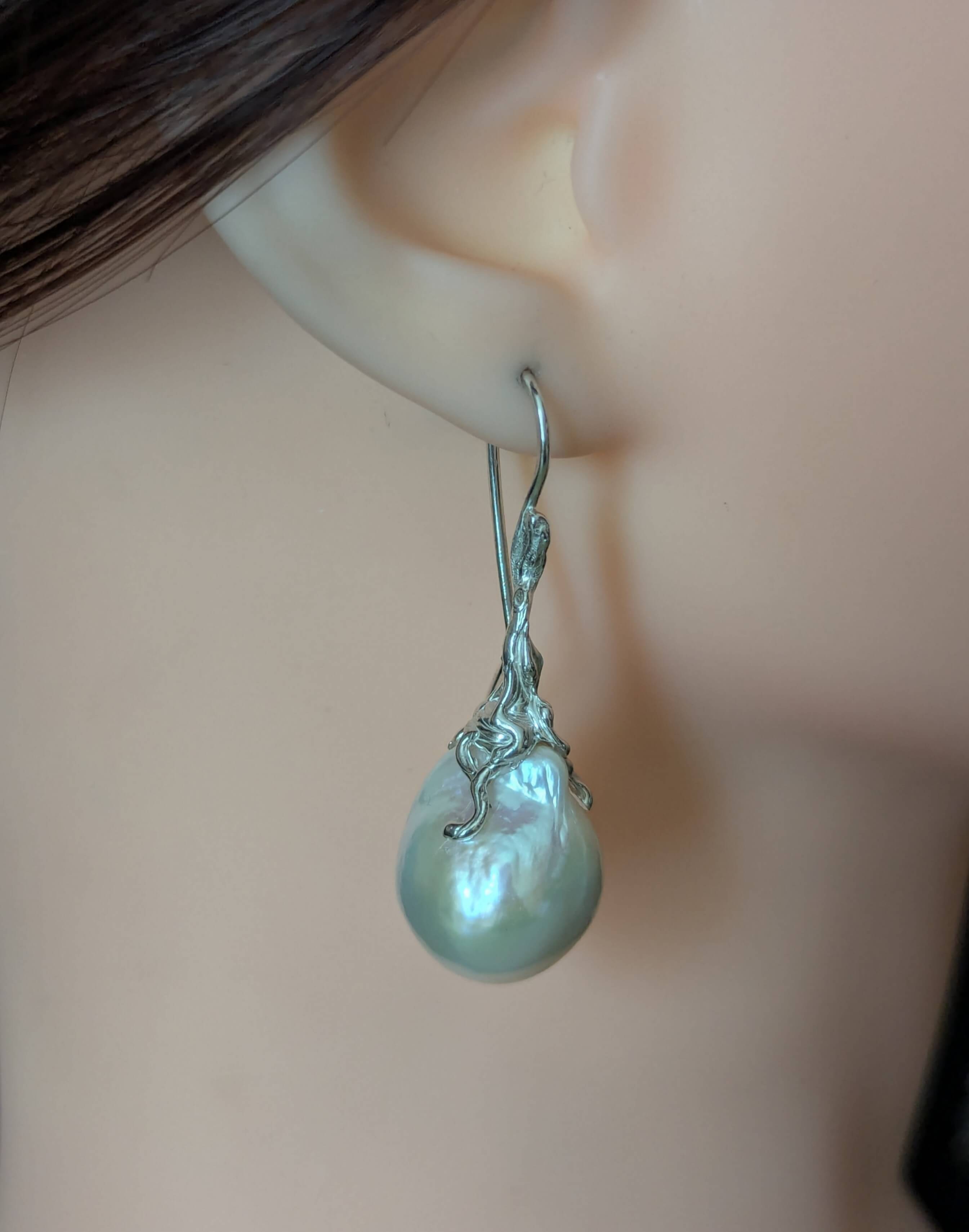 Rankų darbo apysunkiai kabantys auskarai „Sniego lašai“ su dideliais barokiniais baltais perlais, subtiliai įkomponuotais į sidabrines detales. Elegantiški, nėra perkrauti, todėl puikiai tinka tiek kasdienai, tiek ypatingoms progoms