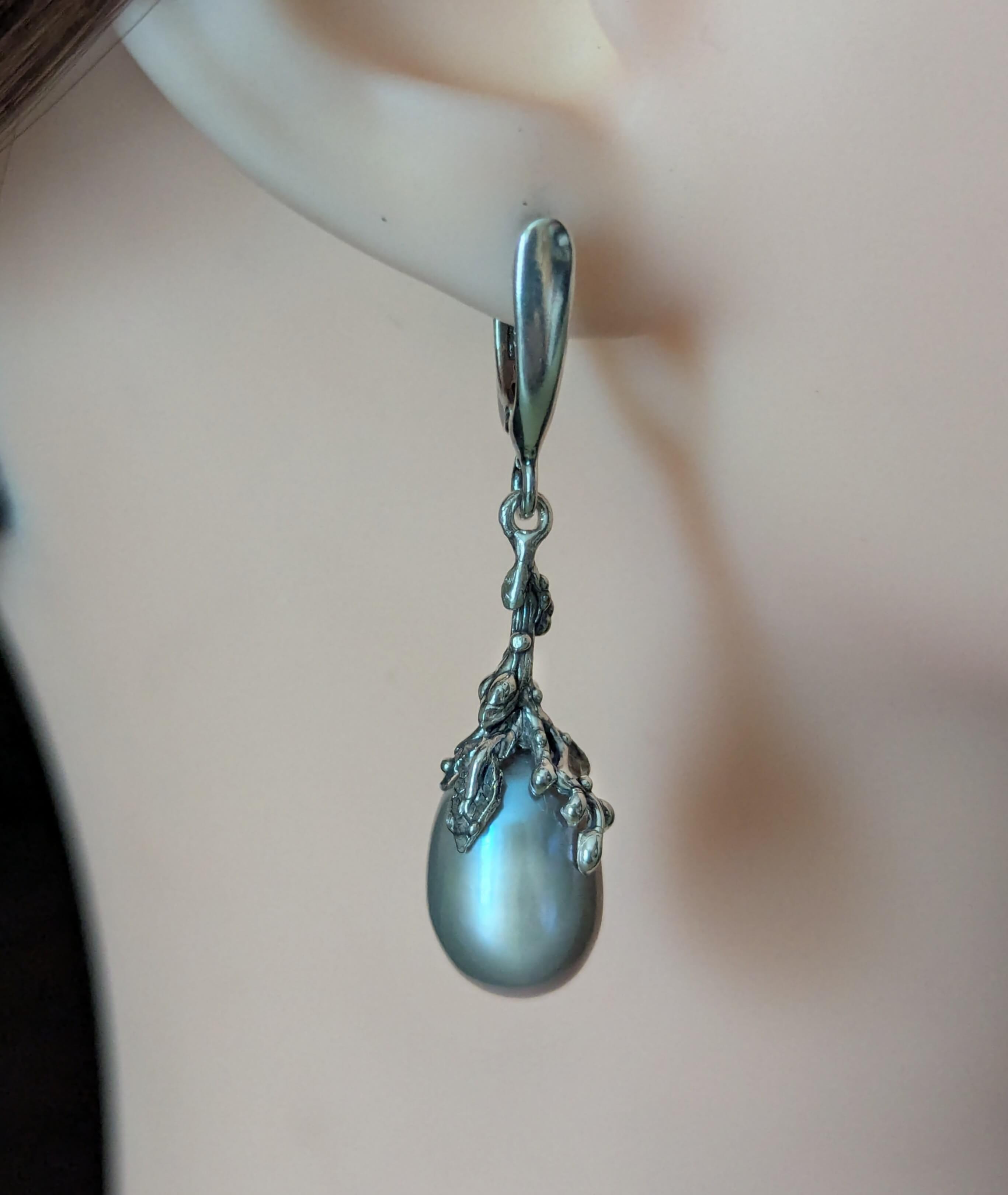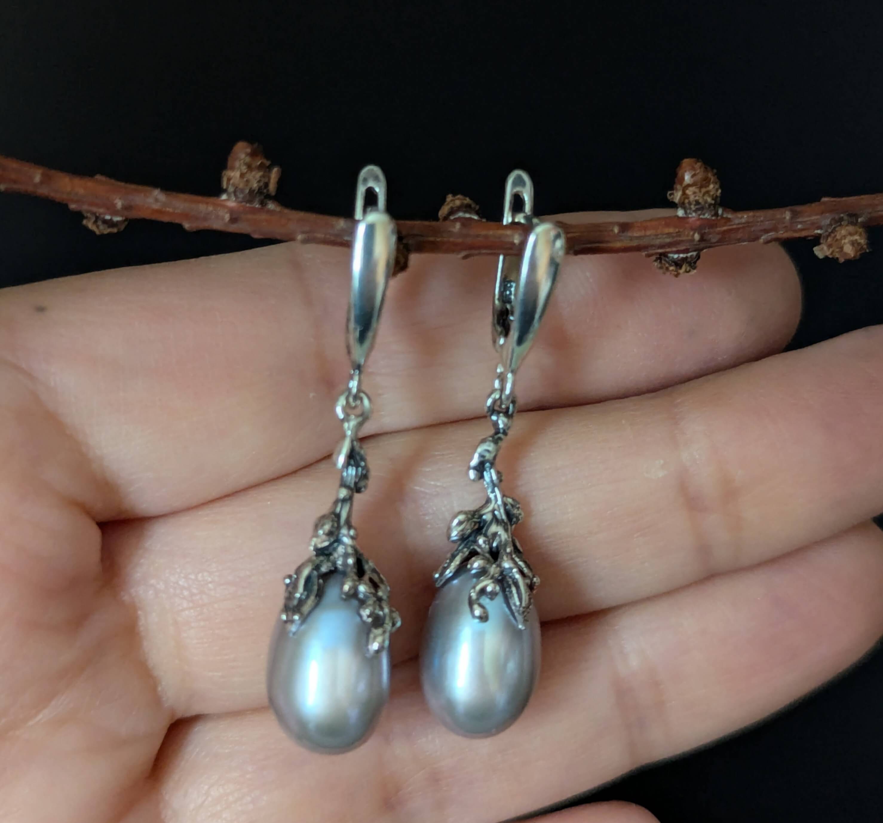 Rankų darbo kabantys auskarai „Pilkieji pumpurai“ – subtilūs, lengvi, kurių pailgi pilki perlai lyg švelnūs kabančių pumpurų akcentai.