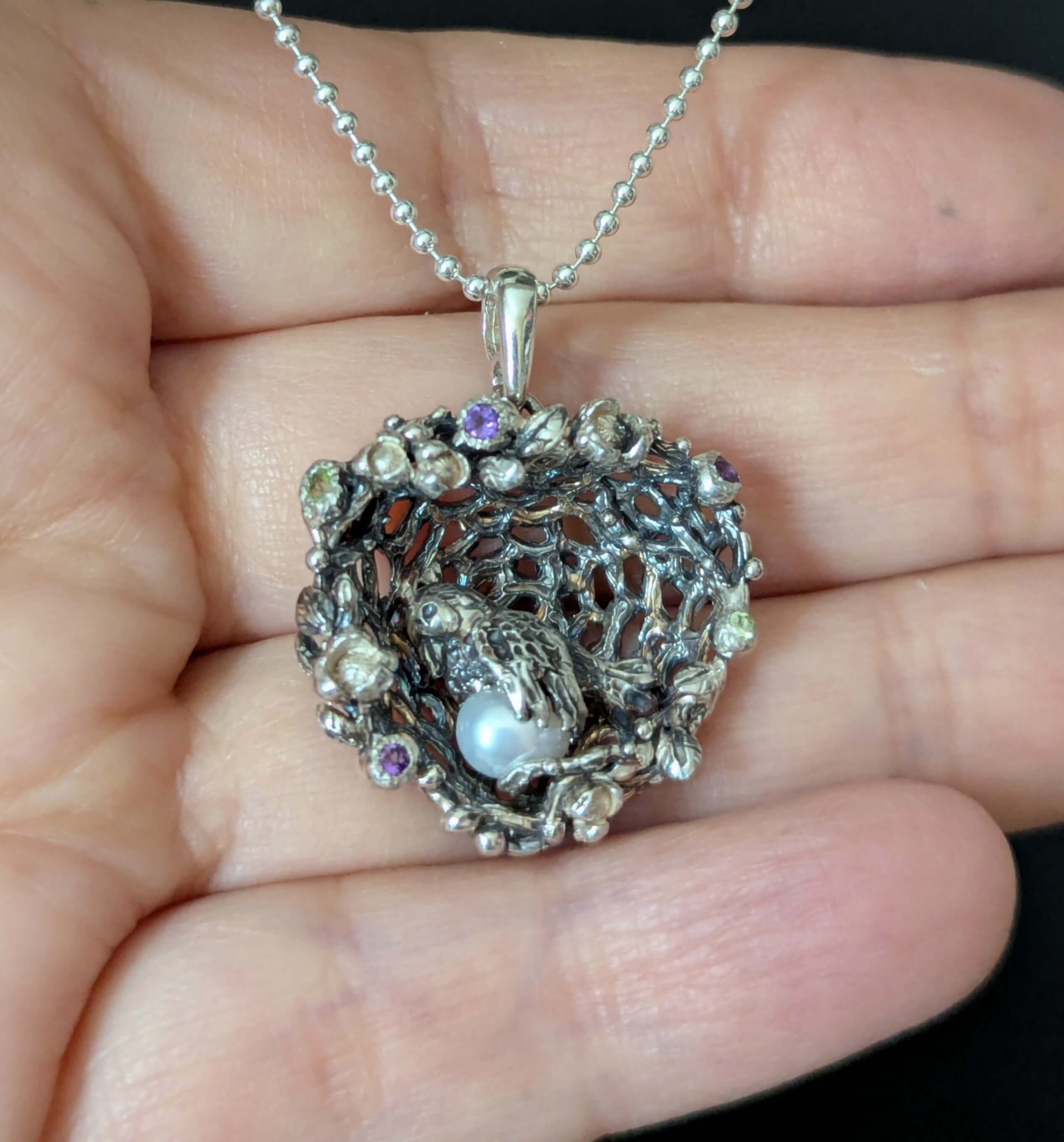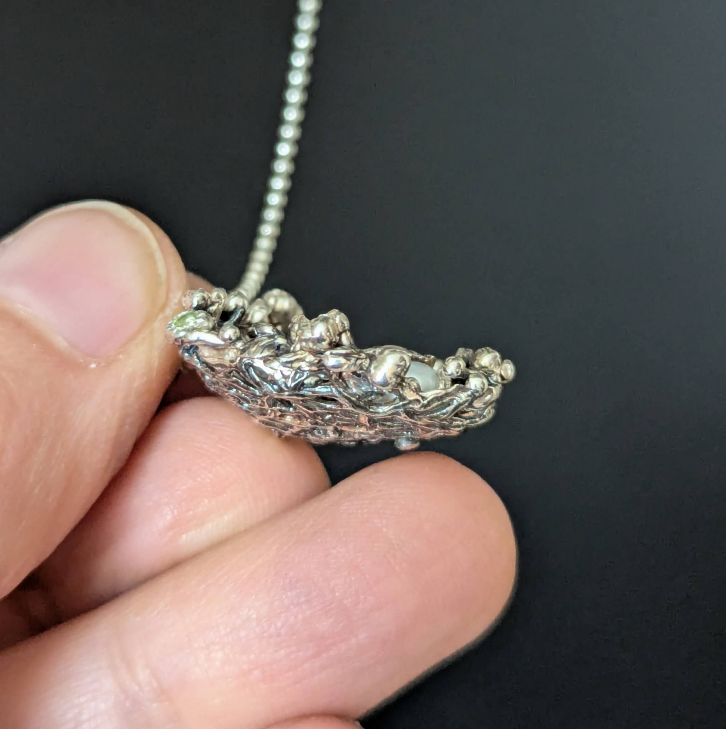 Neeilinis rankų darbo sidabrinis pakabukas „Gyvybės lizdas“ sukurtas širdies formoje – tarsi saugus lizdas, apsuptas žydinčių šakelių. Pakabuko viduje – paukštis, saugantis kiaušinį, kurį simbolizuoja natūralus perlas.