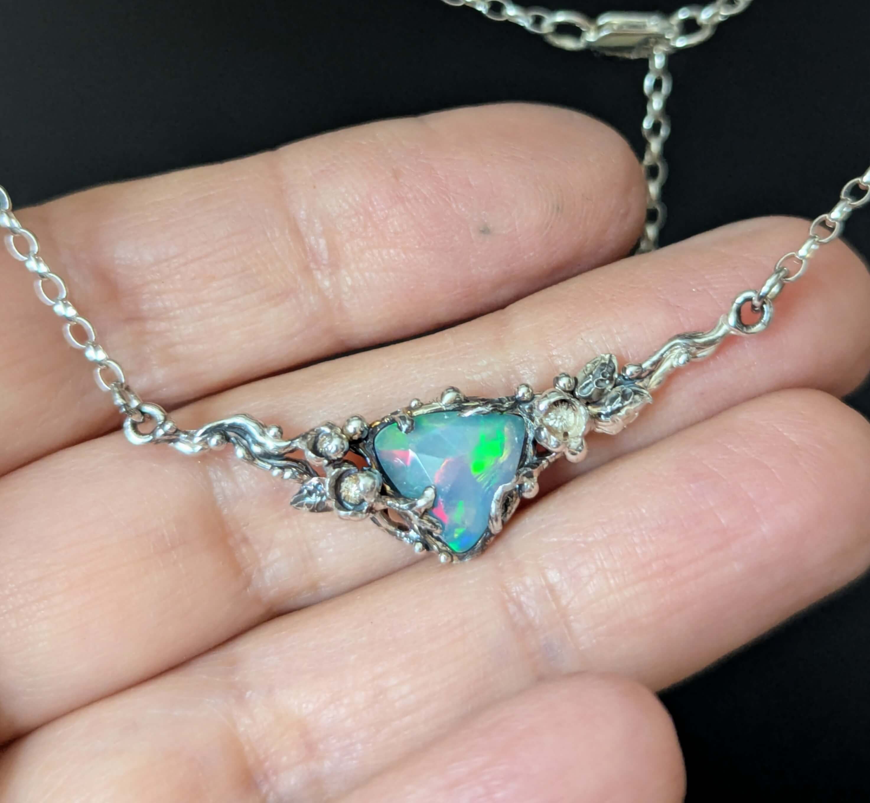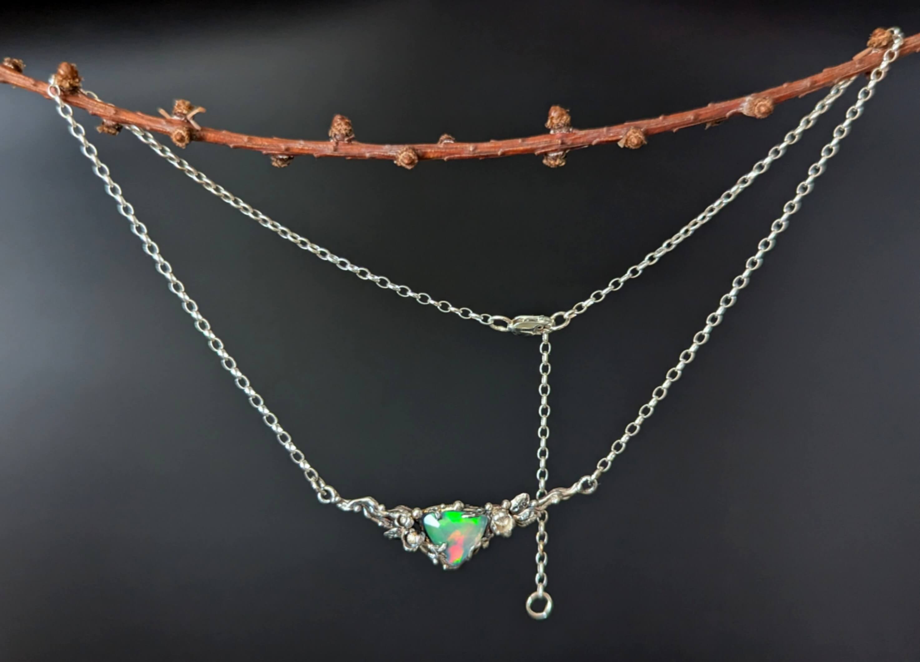 Rankų darbo smulkus sidabrinis grandinėlės vėrinukas „Vaivorykštės žaismas“ su Etiopijos opalu, kurio žaismingas spalvų žaismas primena vaivorykštę. Dekoruotas subtiliais gamtiniais motyvais ir smulkiomis šakelėmis, kurios lengvai susilieja su opalo spindesiu.