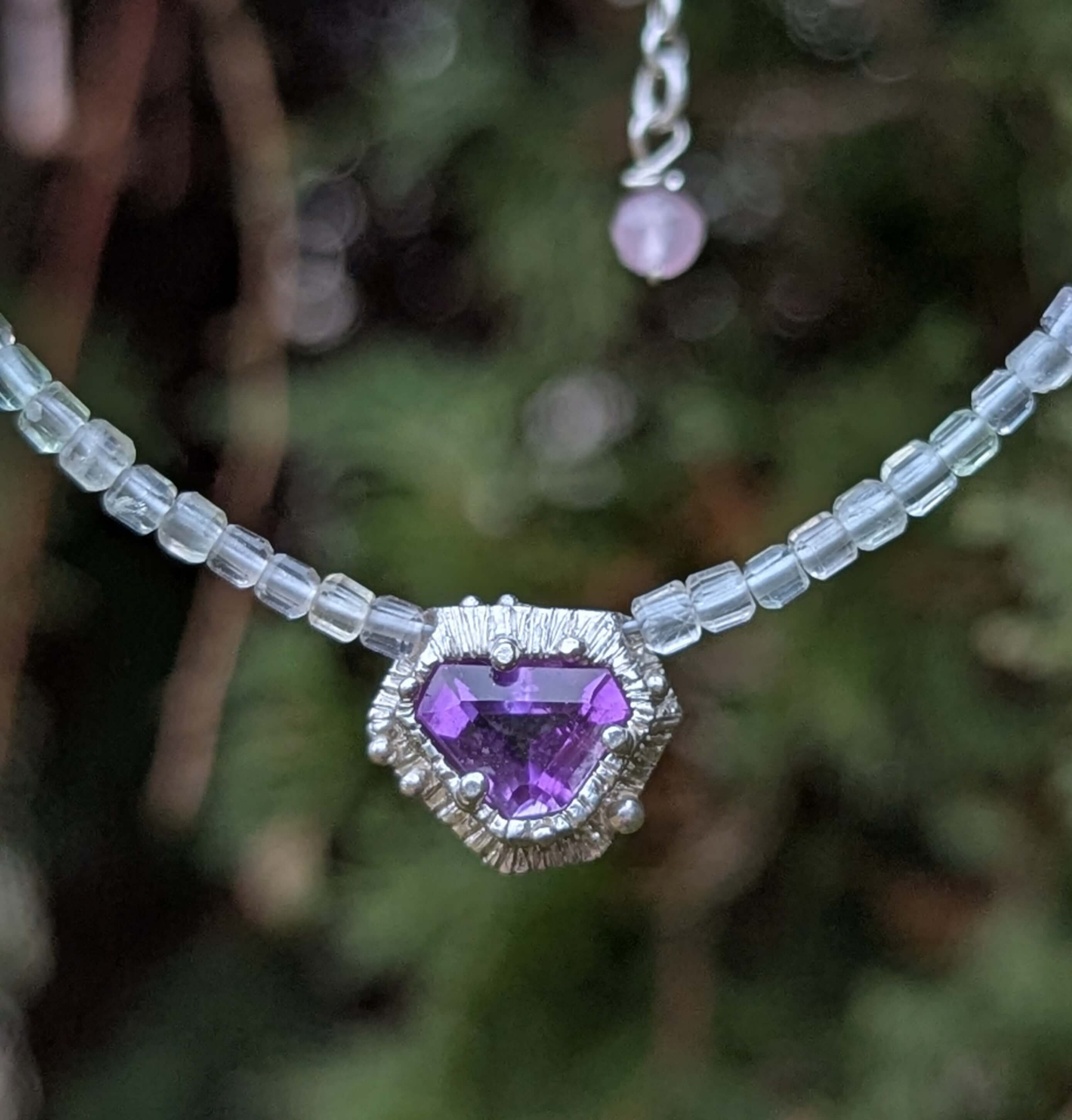 Minimalistinis smulkučių kubelių formos pastelinių violetinių, rausvų, žalsvų, melsvų fluorito karoliukų vėrinėlis su žavingu rankų darbo ametisto pakabuku.