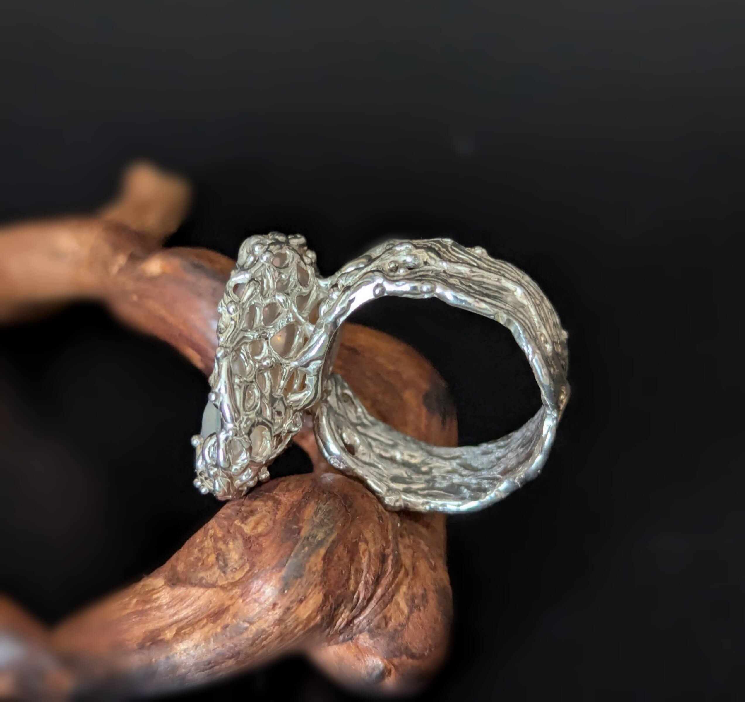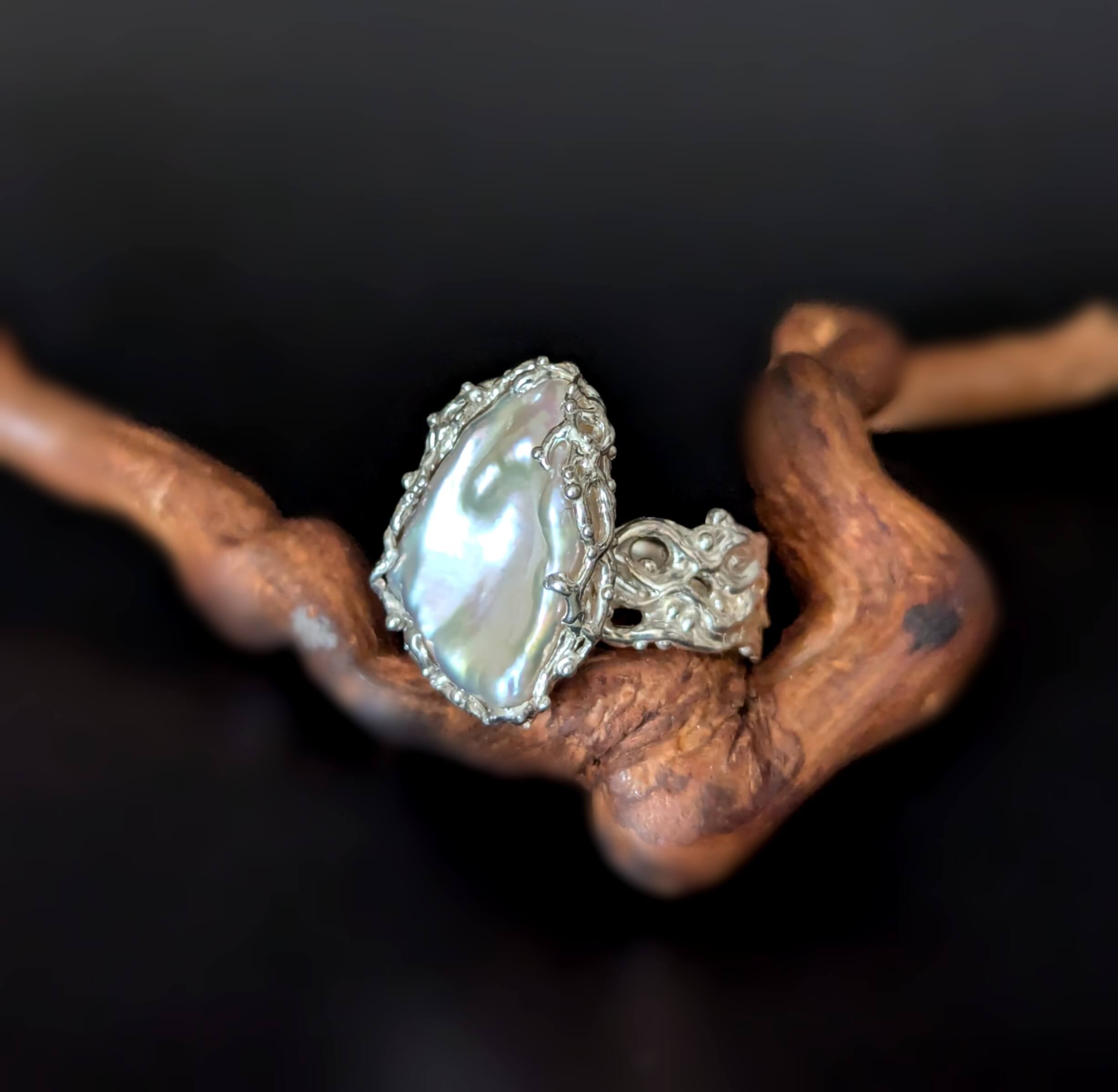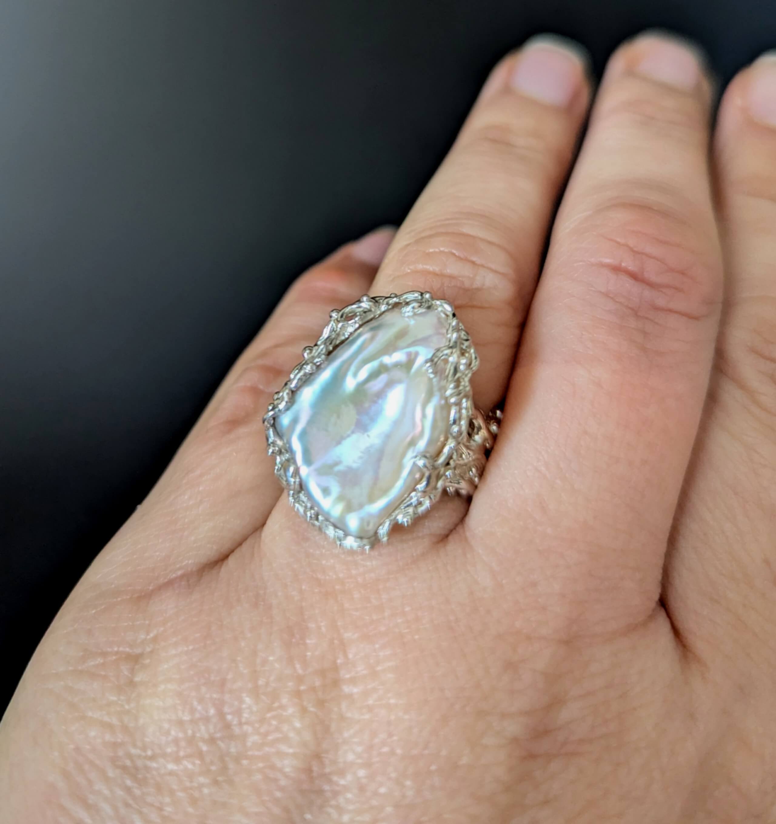 Rankų darbo sidabrinis žiedas su natūraliu keshi perlu, įkomponuotu į ažūrinį sidabro rėmą.